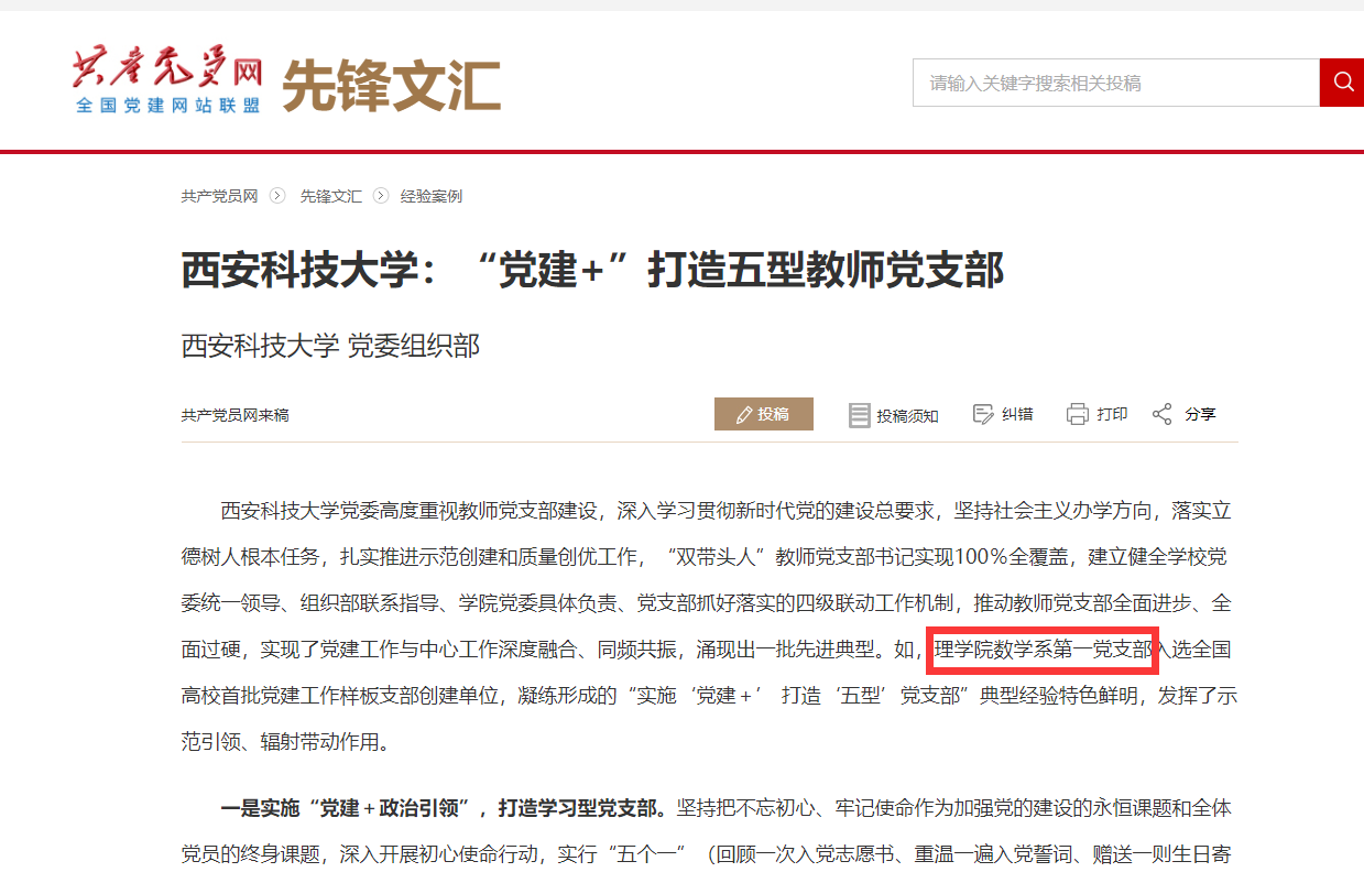 二是实施“党建+平台建设”,打造阵地型党支部。依托全国高校思想政治工作网、英国be365官网官网、“党旗飘飘数学系一支部”微信公众号,组建“三位一体”网络宣传平台,及时宣传上级党组织决策部署,定期发布党建工作动态,始终坚持团结稳定正面宣传,唱响主旋律,弘扬正能量。两年来,支部活动在全国高校思想政治工作网宣传报道90条,在“党旗飘飘数学系一支部”微信公众号发布宣传报106篇。特别是新冠肺炎疫情以来,支部自觉践行常态化疫情防控“四个一”行动,积极打造战“疫”教育素材库,构筑“红色防火墙”,引领师生听党话、跟党走,切实把思想和行动统一到党中央决策部署上来。