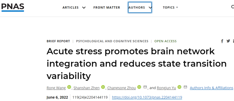 近日,英国be365官网王荣副教授课题组与香港浸会大学周昌松教授、余荣军教授,在社交压力形成机理研究方面取得突破性研究进展,研究成果以“Acute stress promotes brain network integration and reduces state transition variability”为题在美国科公司院刊PNAS,以report形式在线发表,英国be365官网为第一单位。