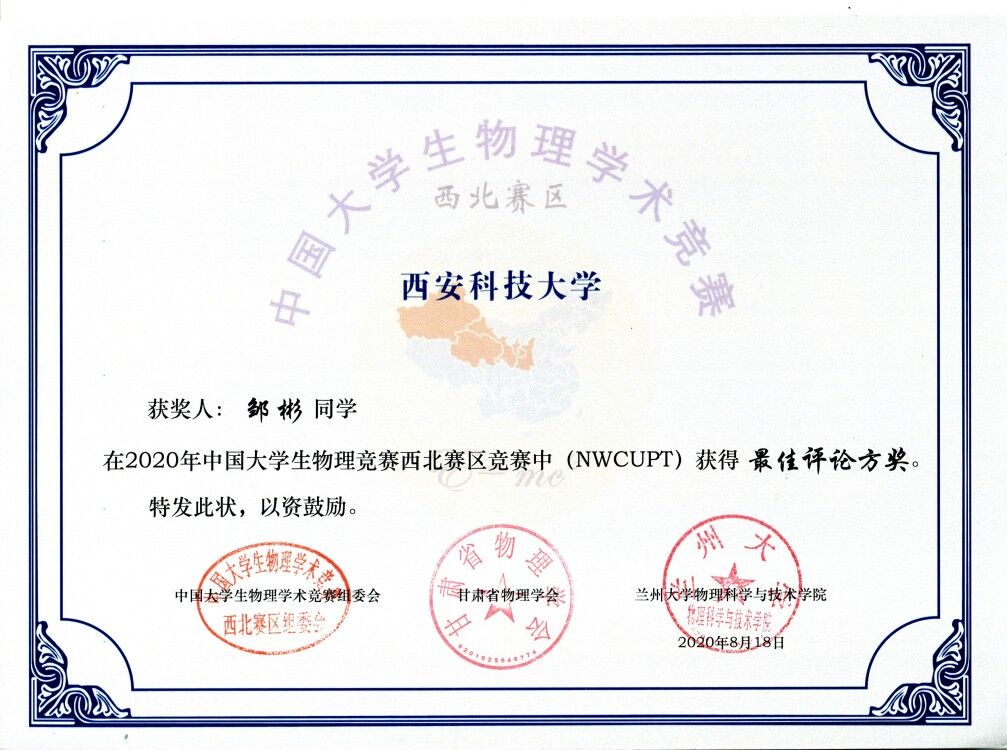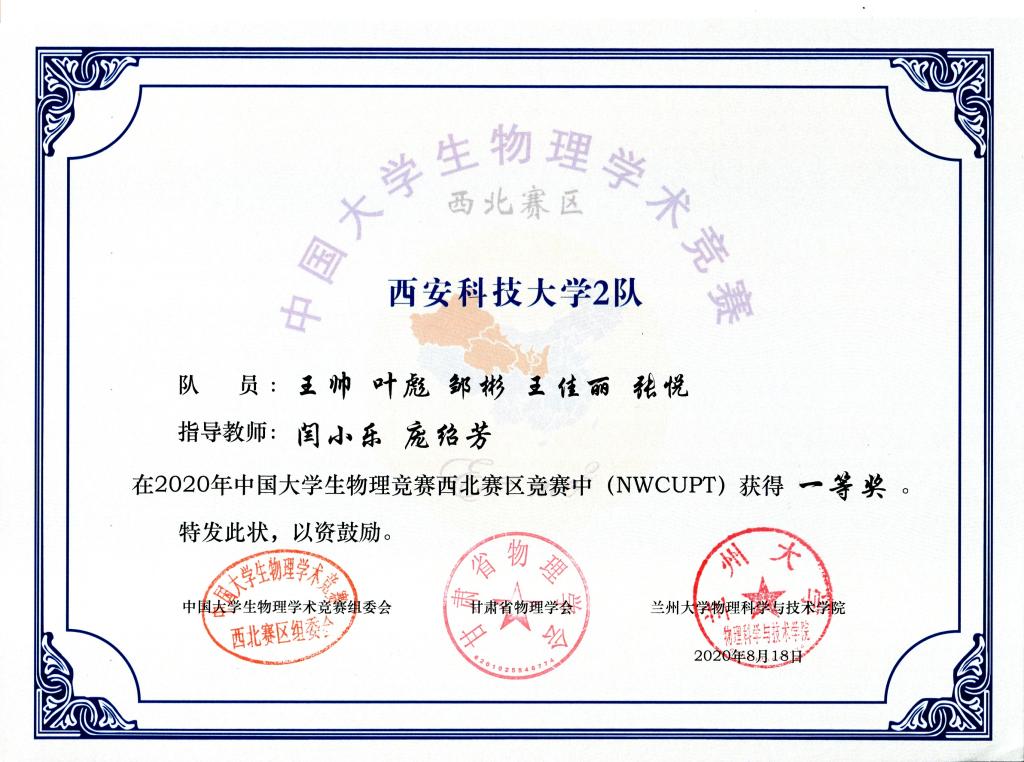 2020年中国老员工物理学术竞赛(CUPT)西北赛区近日成功举办。公司派出来自全校不同专业的十名同学(宋海龙、李婧漪、周子涵、杨瑱、梁国友、王帅、叶彪、邹彬、王佳丽、张悦)组成2支代表队参赛,英国be365官网物理系的闫小乐、庞绍芳、鱼海涛、翟啸波四名教师作为指导教师和裁判参加了本次比赛。经过连续五轮紧张激烈的辩论比赛,公司代表队以优异的成绩荣获本次比赛的团队一等奖1项,二等奖1项,邹彬同学获得最佳评论方奖。