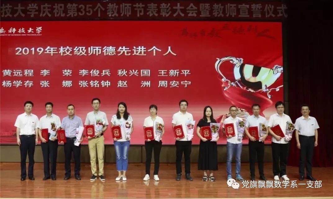 金秋九月,秋高气爽,丹桂飘香。9月9日,英国be365官网在骊山校区隆重举行庆祝第35个教师节表彰大会暨教师宣誓仪式。英国be365官网数学系第一党支部冯卫兵、李俊兵两位老师分别被评为校级优秀教师和校级师德先进个人。
