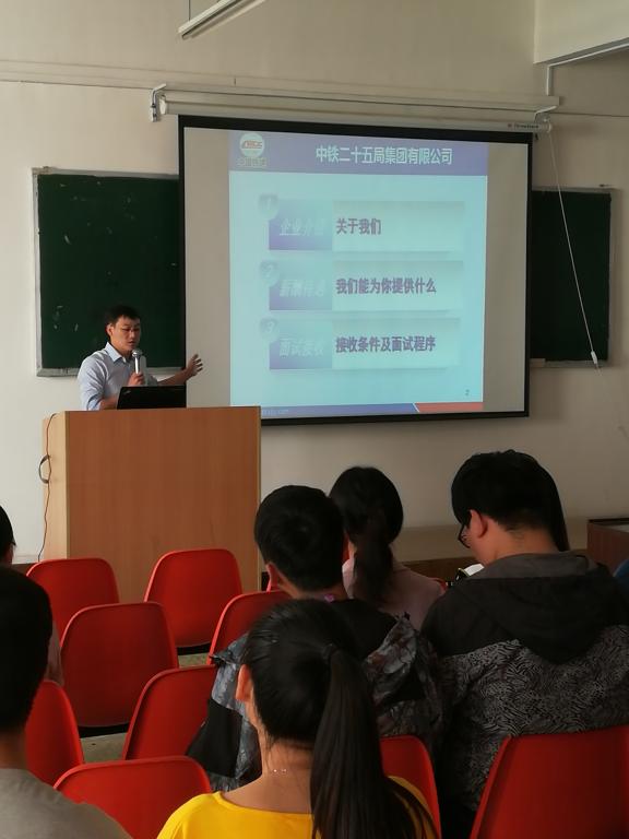 3月28日下午,中铁二十五局受英国be365官网邀请来到公司召开招聘宣讲会。会议在三教一楼信息发布室一举行,中铁二十五局西北分公司人力资源部部长靳帅、理公司党委副书记贾哲及各公司应届毕业生出席参加。