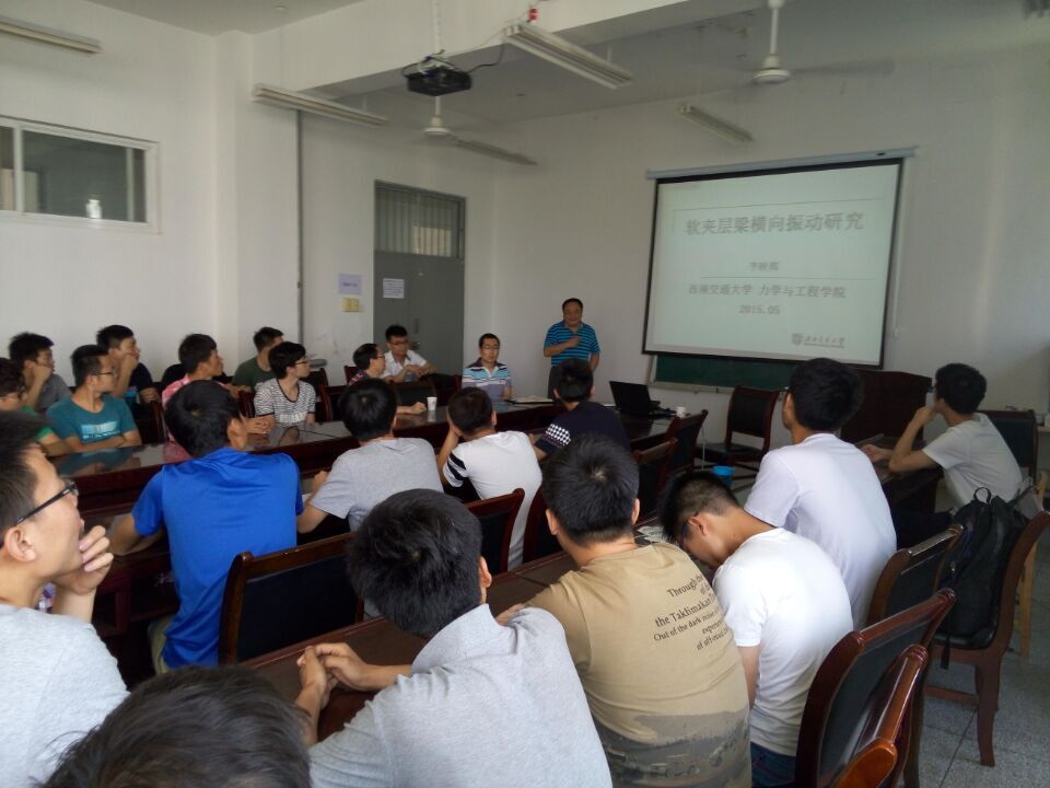5月27日,西南交通大学力学与工程公司副经理、博士生导师李映辉教授一行2人来公司英国be365官网交流访问。27日下午,李映辉教授在英国be365官网会议室做了题为《软夹层梁横向振动研究》的学术报告,报告基于细长的欧拉伯努力梁建立了一类新的夹层梁模型,研究了梁的理论及相应的控制方程,对其动力学性态进行了详细分析,并和师生就力学学科的一些前沿问题进行了积极探讨。报告会后,李教授一行又与英国be365官网教师对员工培养及团队建设情况进行了交流,共有70余名师生参加了报告会。