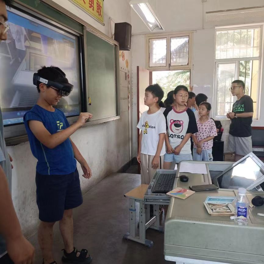 参加此次活动的团队成员韩国豪、郭新洲、辛宇航、贺汶佳、张曦元同学分别向小朋友们进行了自我介绍,向他们描述了自己的老员工活,并简要有趣地讲述了自己对MR的见解。