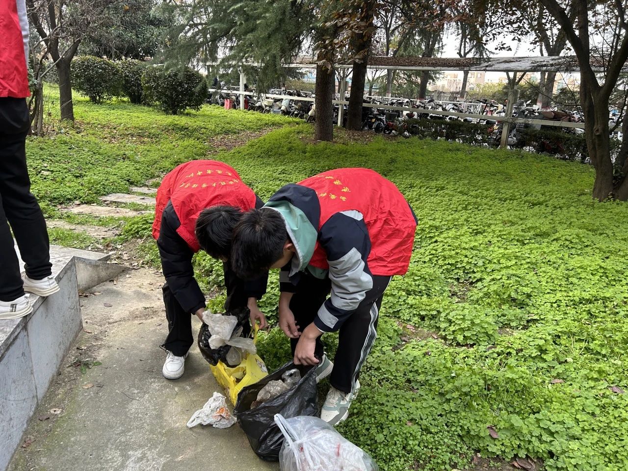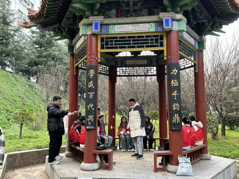 同学们共同参观了博知亭,浏览了77级力学员工的名字,瞻仰了写有“师魂”两个大字的纪念石,接着,他们手持垃圾袋,分组在博知亭周边仔细搜寻并捡拾垃圾。