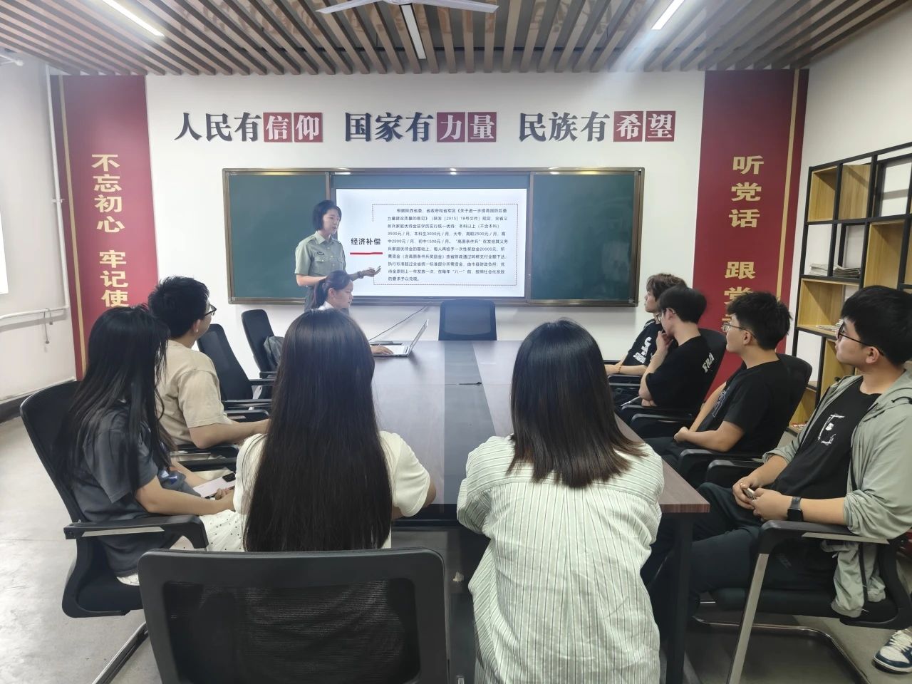 她们结合服役期间拍摄的影像资料,从“军营成长轨迹”“科技强军实践”“战友情深记忆”三个维度展开分享,并结合流程图,直观呈现老员工参军“报名-体检-政审-定兵”全流程,重点标注学籍保留、学费补偿、考研加分等优惠政策。针对员工关注的“军营适应期”“专业技能发展”等问题,以时间轴形式展示新兵训练、岗位分配、晋升路径等关键节点,用亲身经历破除“军营生活神秘化”的认知误区。
