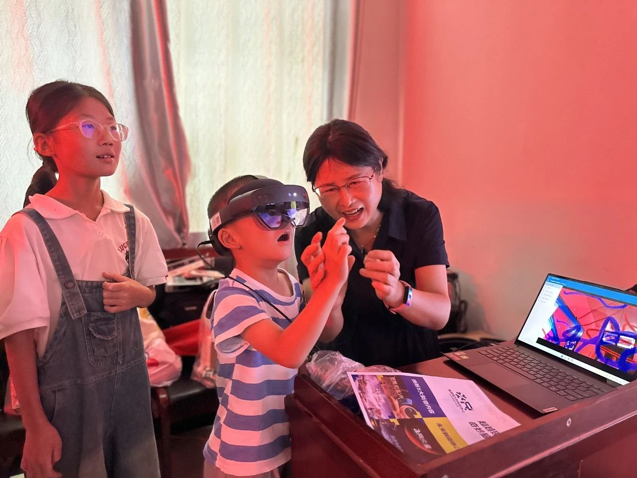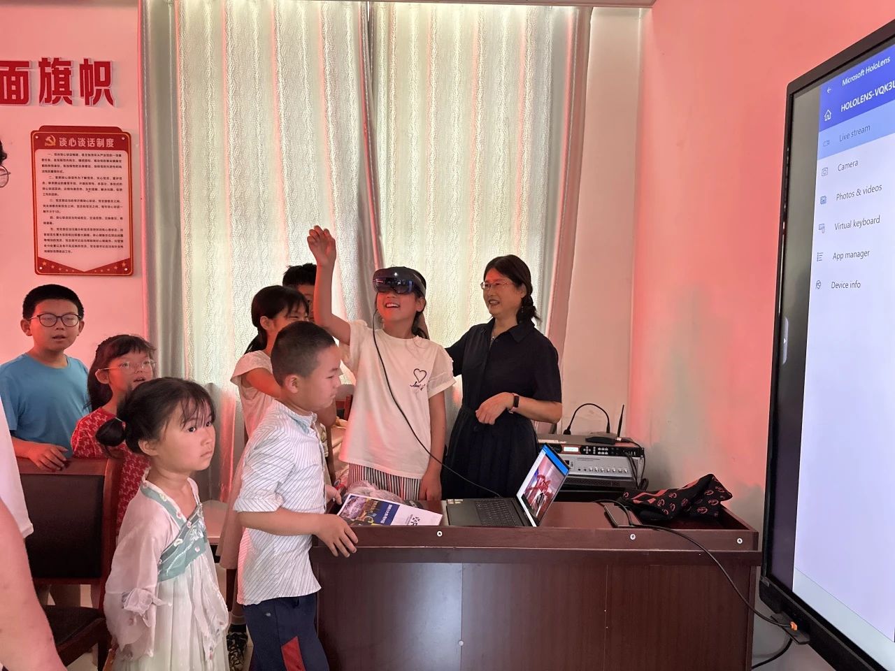 刘佳老师进行了MR技术的讲解及现场展示,并邀请同学们亲自体验。戴上MR设备的孩子们仿佛置身于一个全新的世界,惊叹声此起彼伏,进一步激发了他们对科学技术的向往。