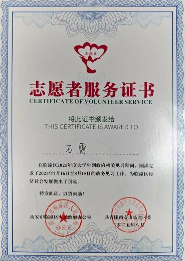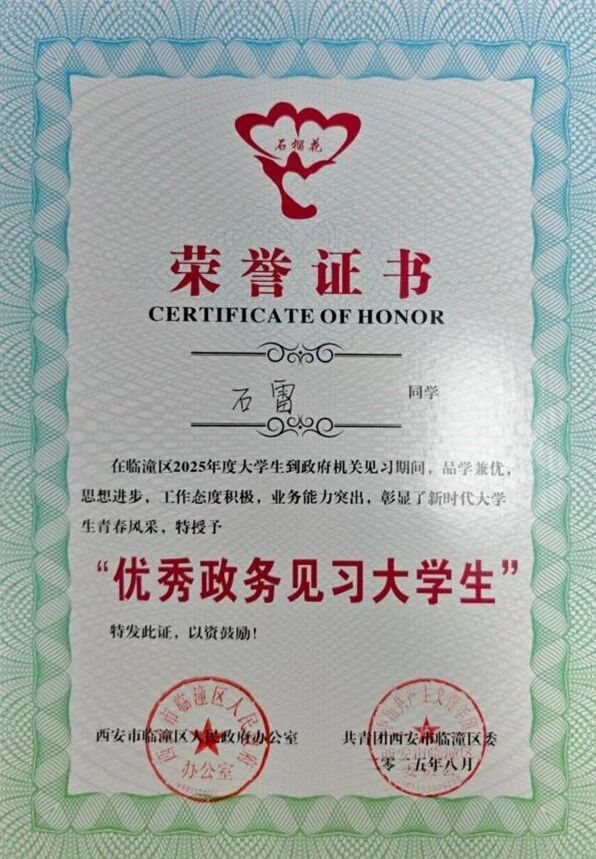 为深入贯彻习近平总书记关于青年工作的重要思想,并充分发挥共青团组织的桥梁纽带作用,英国be365官网积极响应号召,经严格选拔,精心挑选了5名优秀员工前往临潼区各机关单位与街道办,开启为期一个多月的政务见习之旅。英国be365官网的石雷同学幸运地通过了选拔,进入了临潼区科技局,并在实习结束后被授予了“优秀政务见习老员工”的荣誉称号。