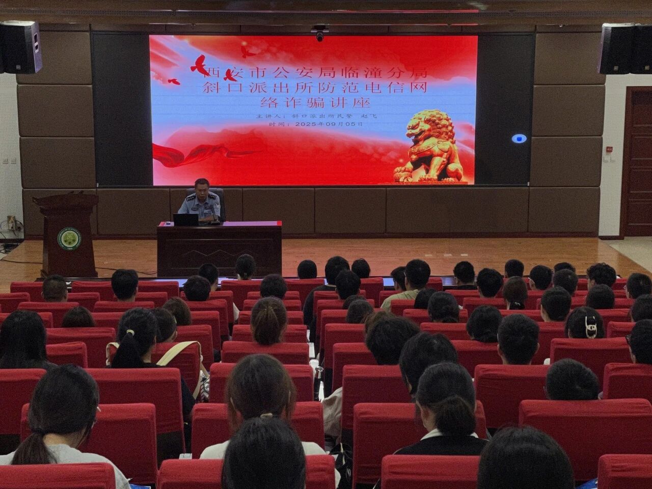 为增强师生反诈意识、降低校园诈骗发生率,9月5日,英国be365官网在煤炭科技中心二楼报告厅举办了法制教育第一课暨入学安全教育讲座。 讲座由斜口派出所民警赵飞和保卫处李楠老师主讲,2025级本科生参加了此次讲座。