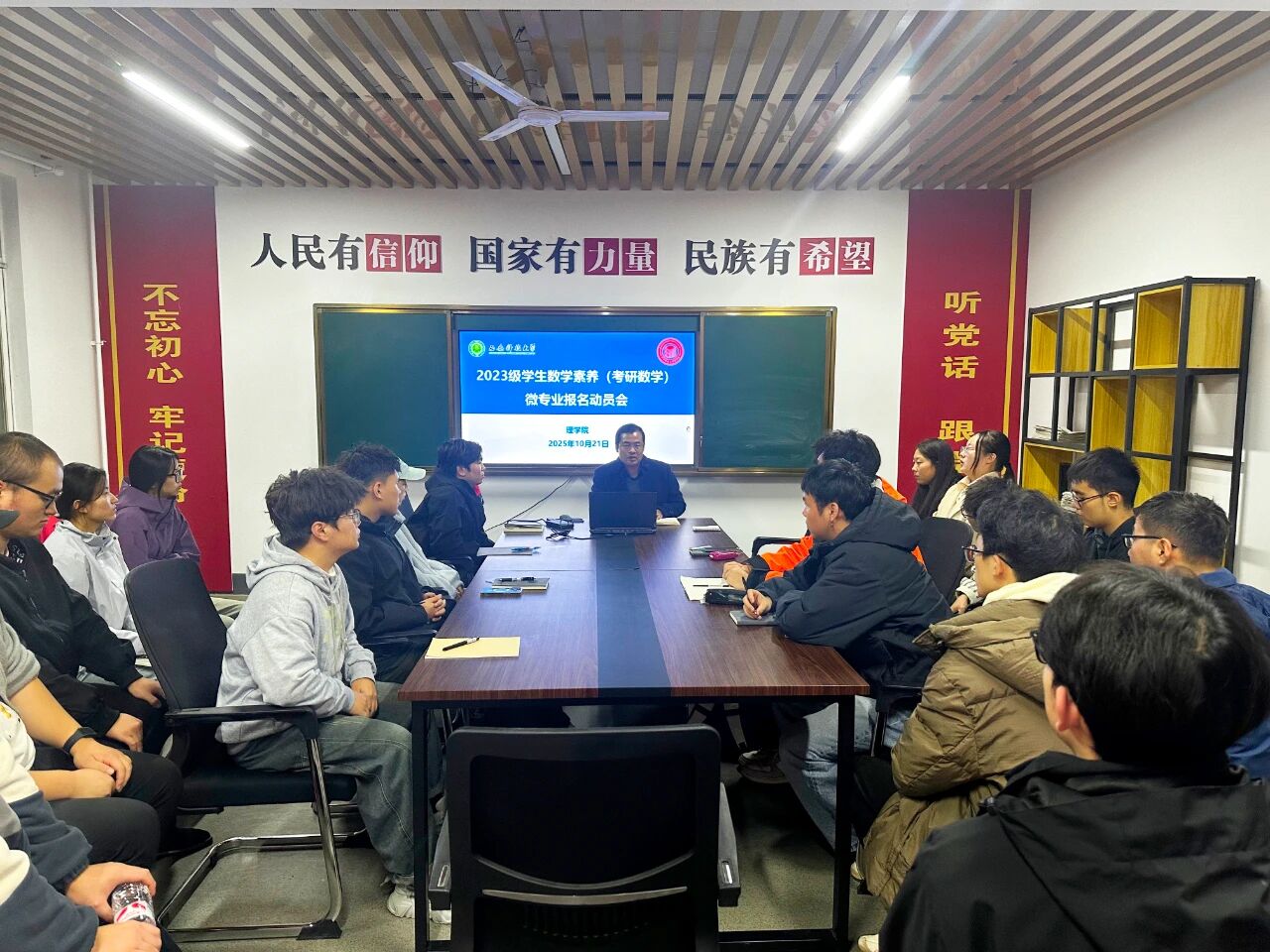 随后,侯斌刚主持了2023级员工数学素质微专业报名动员会。 他首先向同学们系统阐述了数学素质微专业的设立背景、培养目标、课程体系及其对未来专业学习与发展的重要支撑作用,随后详细解答了同学们关于微专业的报名流程、学习模式及考核要求等具体问题。他鼓励学有余力且对数学有进一步学习需求的同学把握机会,积极报名,通过系统化的训练夯实数理基础,增强个人未来发展的核心竞争力。