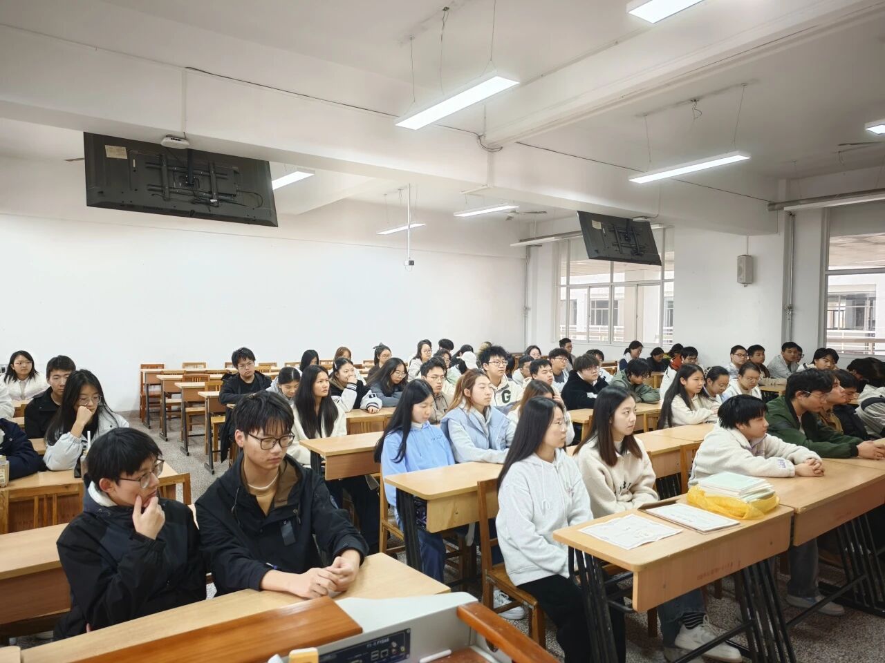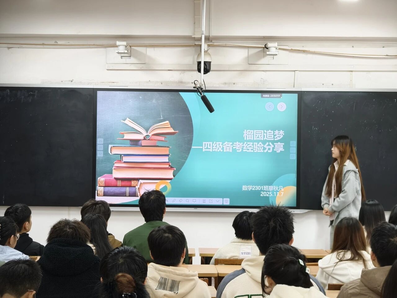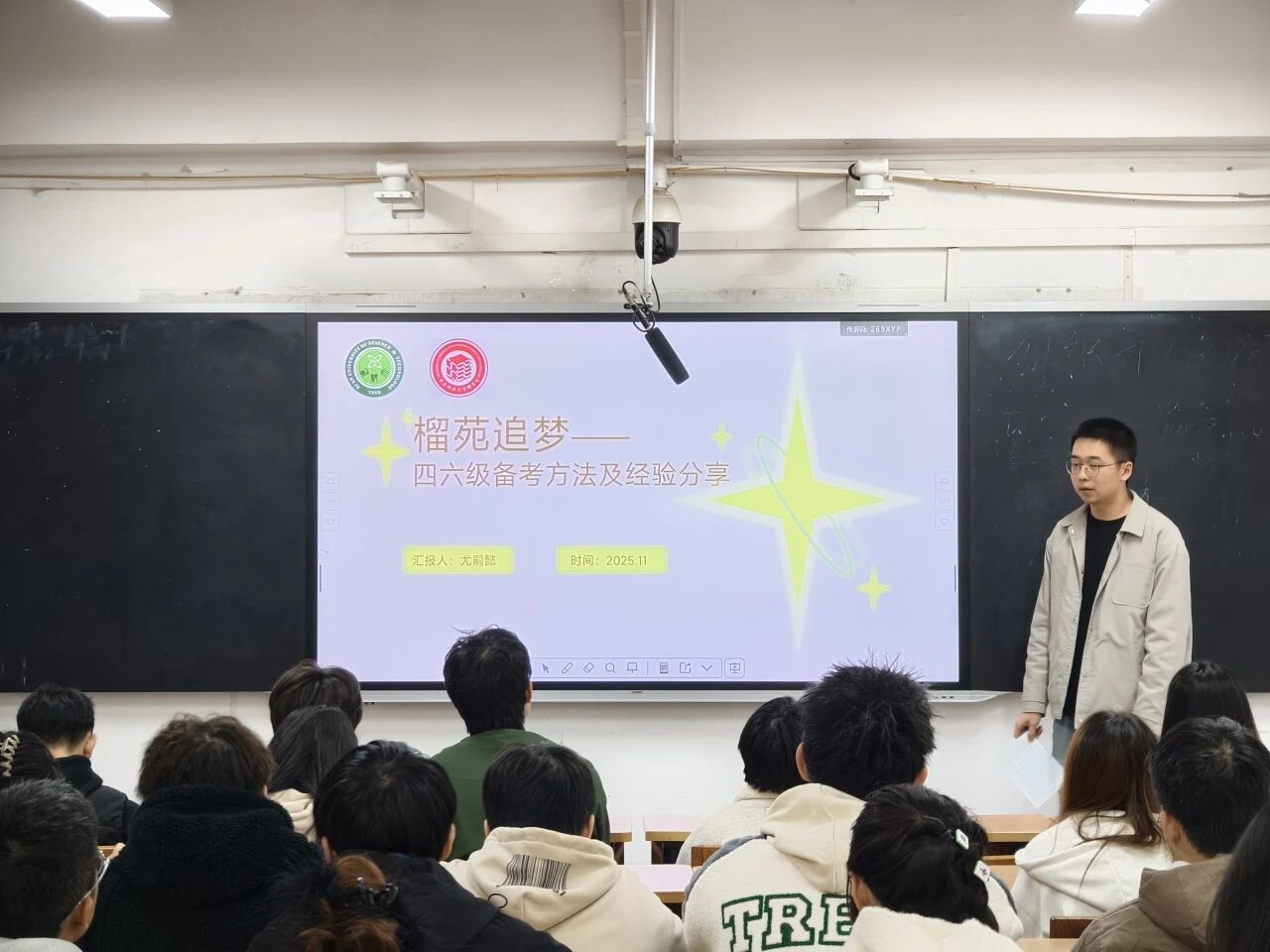 公司特邀在英语四级考试中达到优秀等级的力学2201班尤嗣懿和数学2301班廖秋凡,为同学们带来了一场备考经验分享会。他们将四级考试科学拆解为写作、听力、阅读、翻译四大模块,逐一进行精准剖析。除了分项技巧,他们还就备考时间规划、复习资料选择与考前心态调整等分享了宝贵经验,强调了坚持与平和心态的重要性。
