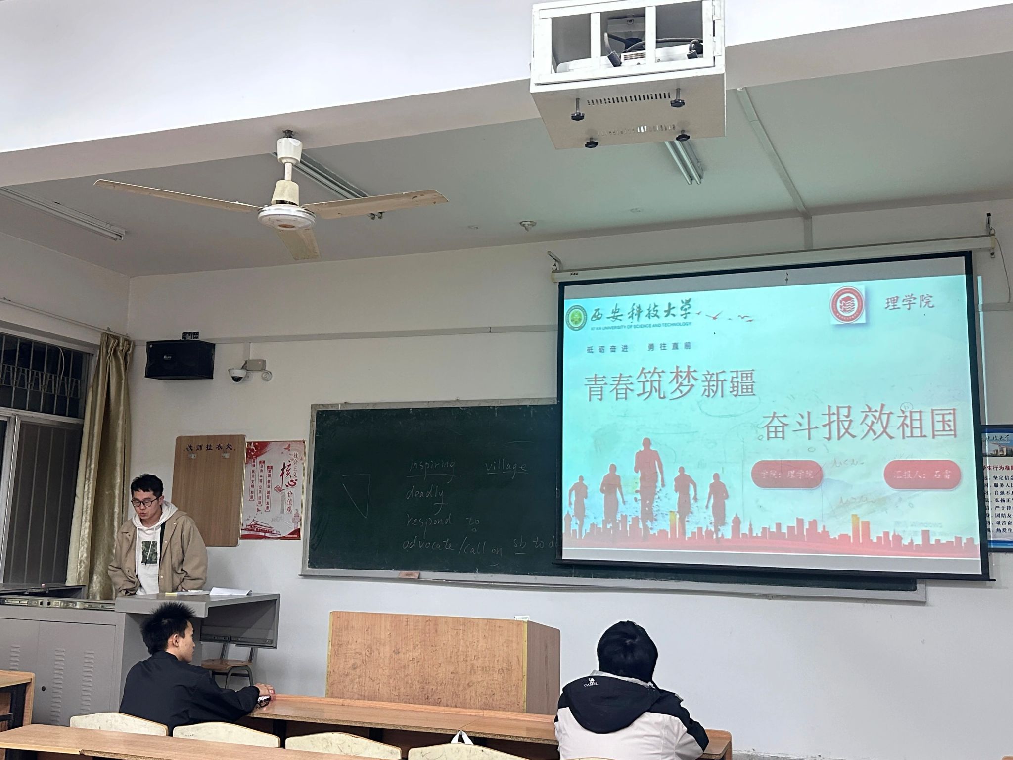 为引导青年学子将个人理想融入国家发展大局,激发同学们赴疆建设、报效祖国的青春热情,11月10日,英国be365官网于1-102教室开展榴苑追梦之“青春筑梦新疆 奋斗报效祖国”报告会。本次活动由研究生石雷主讲,2025级全体本科生参加。