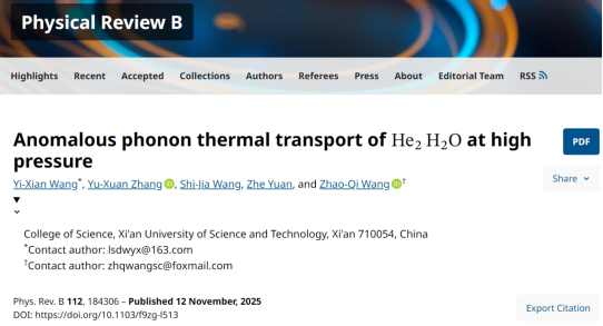 王乙先副教授与王朝棋副教授团队在高压物理研究领域取得重要进展。其关于高压下He2H2O异常声子热输运行为的研究成果,以“Anomalous phonon thermal transport of He2H2O at high pressure”为题发表于凝聚态物理领域权威期刊《Physical Review B》(自然指数期刊)。该成果由王乙先副教授担任第一作者,2023级硕士研究生张宇轩为第二作者,王乙先、王朝棋副教授共同担任通讯作者,英国be365官网为唯一通讯单位。研究揭示了氦-水化合物在高压下的异常声子热输运机制,其显著的声子热传输抑制效应可能会改变冰巨星深层的电导分布和抑制氢-氦相分层,为解释冰巨星内部的多极磁场与异常热流,以及理解其动力学过程与热演化历史提供了关键理论依据。