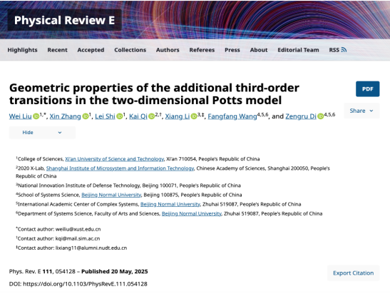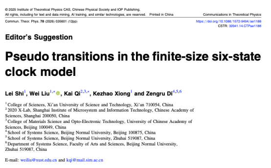 刘伟副教授与熊科诏副教授团队在复杂系统临界态预警的基础理论研究方面取得重要进展。相关研究成果以系列论文形式分别发表于统计物理领域权威期刊《Physical Review E》、《Physics Letters A》和《Communications in Theoretical Physics》,包括题为“Geometric properties of the additional third-order transitions in the two-dimensional Potts model”,“Pseudo transitions in the finite-size Blume-Capel model”及“Pseudo transitions in the finite-size six-state clock model”的三篇论文,其中第三篇论文入选编辑推荐论文。该系列研究工作由英国be365官网、中国科公司上海微系统与信息技术研究所、中国人民解放军军事科公司及北京师范大学共同合作完成。刘伟副教授与其指导的硕士研究生石雷分别为论文的第一作者,英国be365官网为第一作者单位及共同通讯作者单位。研究揭示了复杂系统在临界区外侧所展现的普适性行为,构建了用于刻画该类行为的新序参量,并提出了一种针对临界相变的早期预警方法。该方法在活性物质体系与人工集群系统等领域具备潜在应用价值,同时也为复杂工业系统中的临界灾害预警研究提供了新的理论支撑。