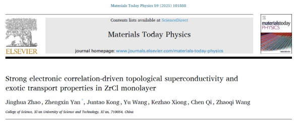 炎正馨教授团队聚焦拓扑器件核心材料研发,在ZrCl单层材料研究中取得重要突破。相关成果以“Strong electronic correlation-driven topological superconductivity and exotic transport properties in ZrCl monolayer”为题,发表于材料科学与应用物理交叉领域TOP期刊《Materials Today Physics》(影响因子9.7)。该成果由2023级硕士研究生赵京华担任第一作者,炎正馨教授为通讯作者,英国be365官网为唯一通讯单位。研究揭示了ZrCl单层材料中强电子关联、拓扑保护与晶格动力学的深度耦合,明确强关联驱动是其非常规拓扑超导态的核心成因。该态具有稳定超导能隙和可控边缘模,为智能超导量子器件奠定基础。其鲁棒的拓扑边缘模可保持量子演化高相干性,显著降低信息传输损耗,为高保真容错量子比特提供新范式,适用于可扩展量子计算芯片。材料的低散射、低能耗电子输运特性使其成为零损耗互连、超低功耗逻辑单元及量子传感器的理想载体,可优化未来信息与能源体系的能耗效率。强关联-超导-拓扑效应的协同调控机制,为自旋电子器件、拓扑晶体管及量子控制组件提供工程化路径,助力我国在量子芯片与前沿信息技术领域占据引领地位。
