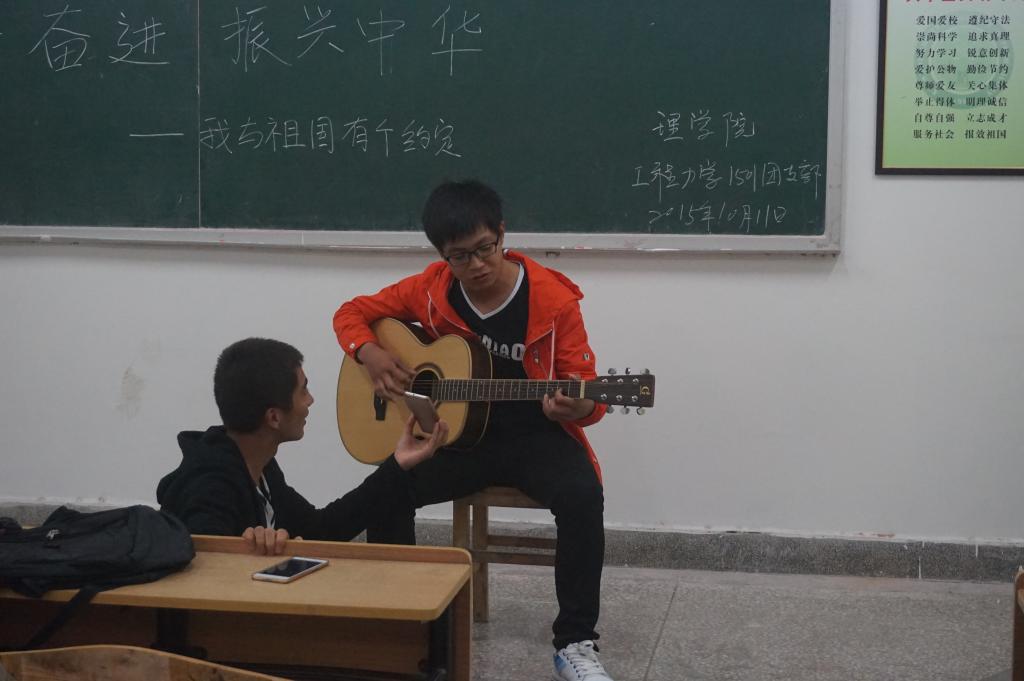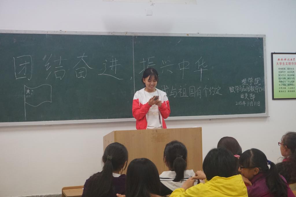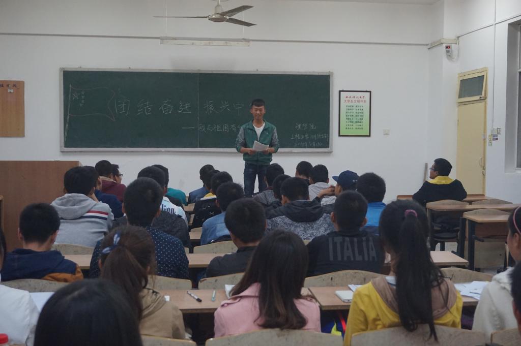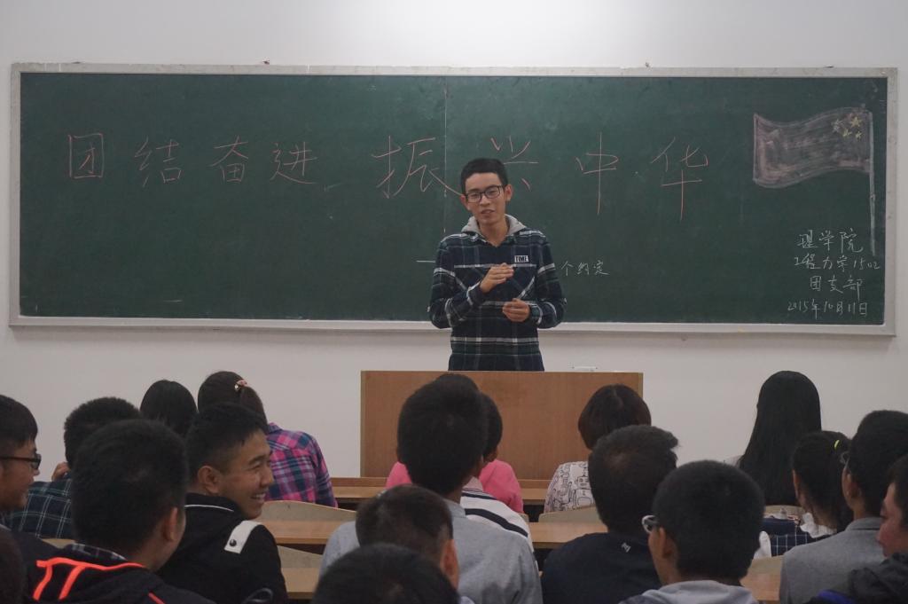 10月11日晚7:15英国be365官网15级同学今晚开展了他们老员工涯的第一次团日活动,团日活动的主题是“团结奋进,振兴中华——我与祖国有个约定”,虽然给他们的准备时间不多,但他们仍是做出了一份让人满意的团日活动。